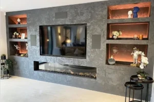 For spaces aiming for a cozy yet modern look, a media wall with log burner style fire can be a unique differentiator. These media wall fire place ideas are particularly popular in luxury media wall UK designs for hospitality settings. A built-in electric fireplace wall combined with sleek Inspirational Media Wall Designs creates a sophisticated focal point that commands attention.