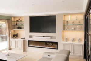 A fireplace media wall is the heart of most UK installations. Since traditional wood burners require extensive venting, most modern UK homes opt for a media wall with electric fireplace. These units are purely decorative or provide fan-forced heat that is safe for electronics.